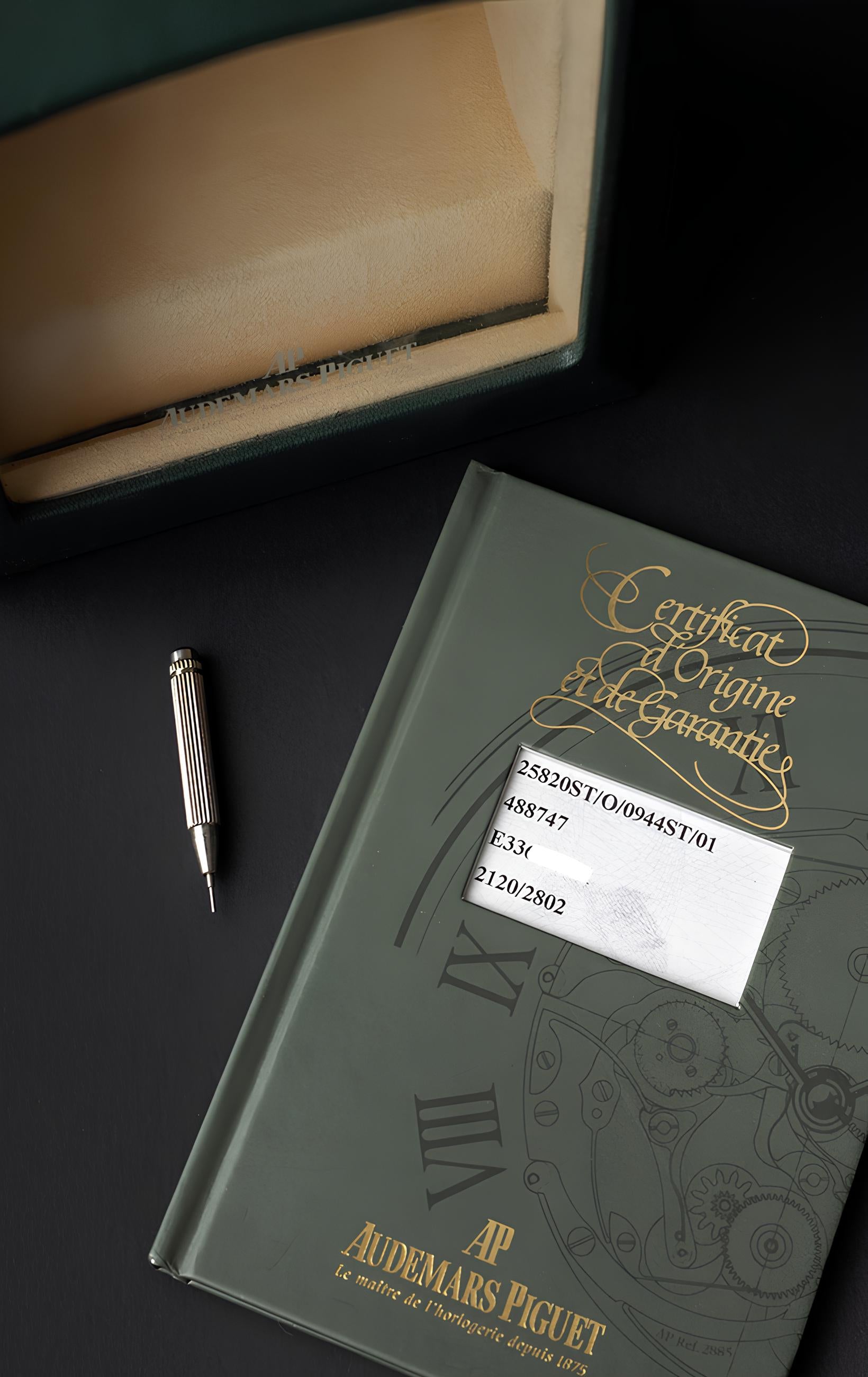 This Royal Oak Quantième Perpétuel is powered by the AP caliber 2120/2802, derived from Jaeger-LeCoultre’s legendary ultra-thin JLC 920 caliber, also adopted by Patek Philippe and Vacheron Constantin. The ultra-thin automatic caliber 2120/2800 features 38 jewels, a Gyromax balance, and four ruby wheels to support the full-diameter rotor, which runs on a beryllium guide for added stability. The AP caliber 2120 is considered one of the most technically refined wristwatch movements ever made.