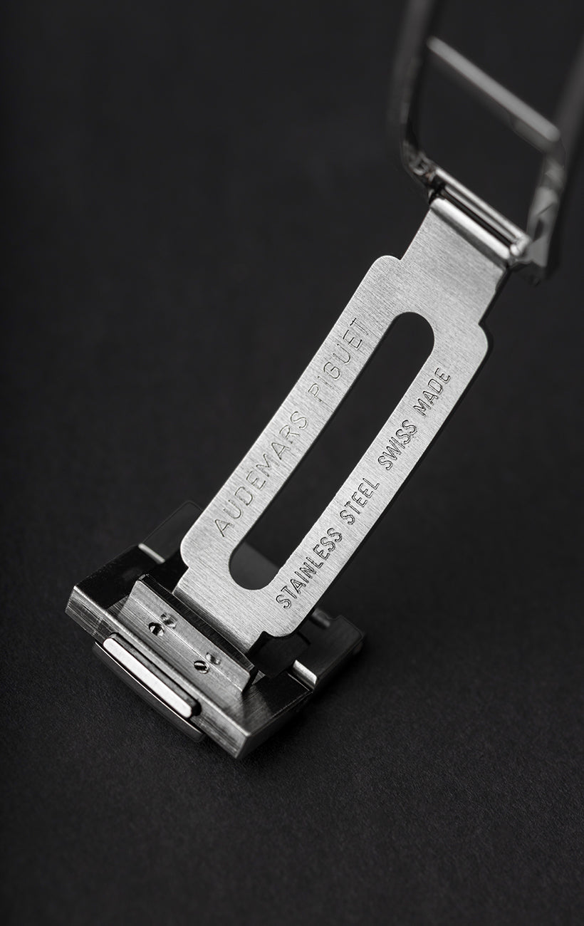The main feature that distinguishes it from all other Royal Oaks is the absence of AP's classic "Tapisserie" workmanship, in favor of a completely smooth dial. The stainless steel case and bracelet are finely finished with beveled and polished edges, contrasting with the brushed surface. The case has a diameter of 39 mm and a thickness of 9.3 mm.
