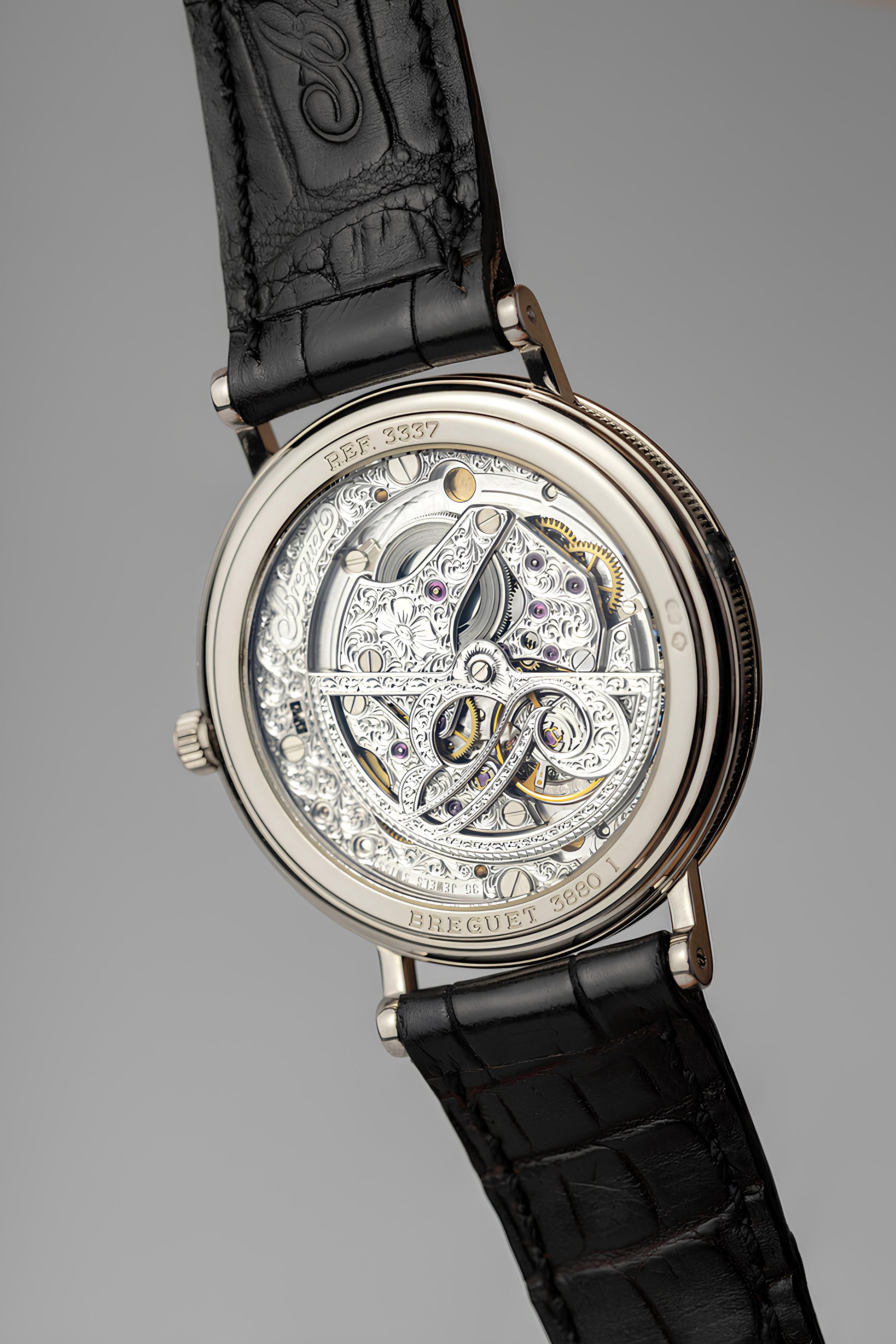 The true marvel of the Classique is revealed on the back. Here, the Breguet caliber 502, with its off-center winding rotor, showcases meticulous craftsmanship. This 18ct white gold movement, featuring skeletonized parts and hand decorations, represents the pinnacle of haute horlogerie. With mirror-polished screws and exquisite anglage, the caliber 502 is a masterpiece of engineering and artistry.