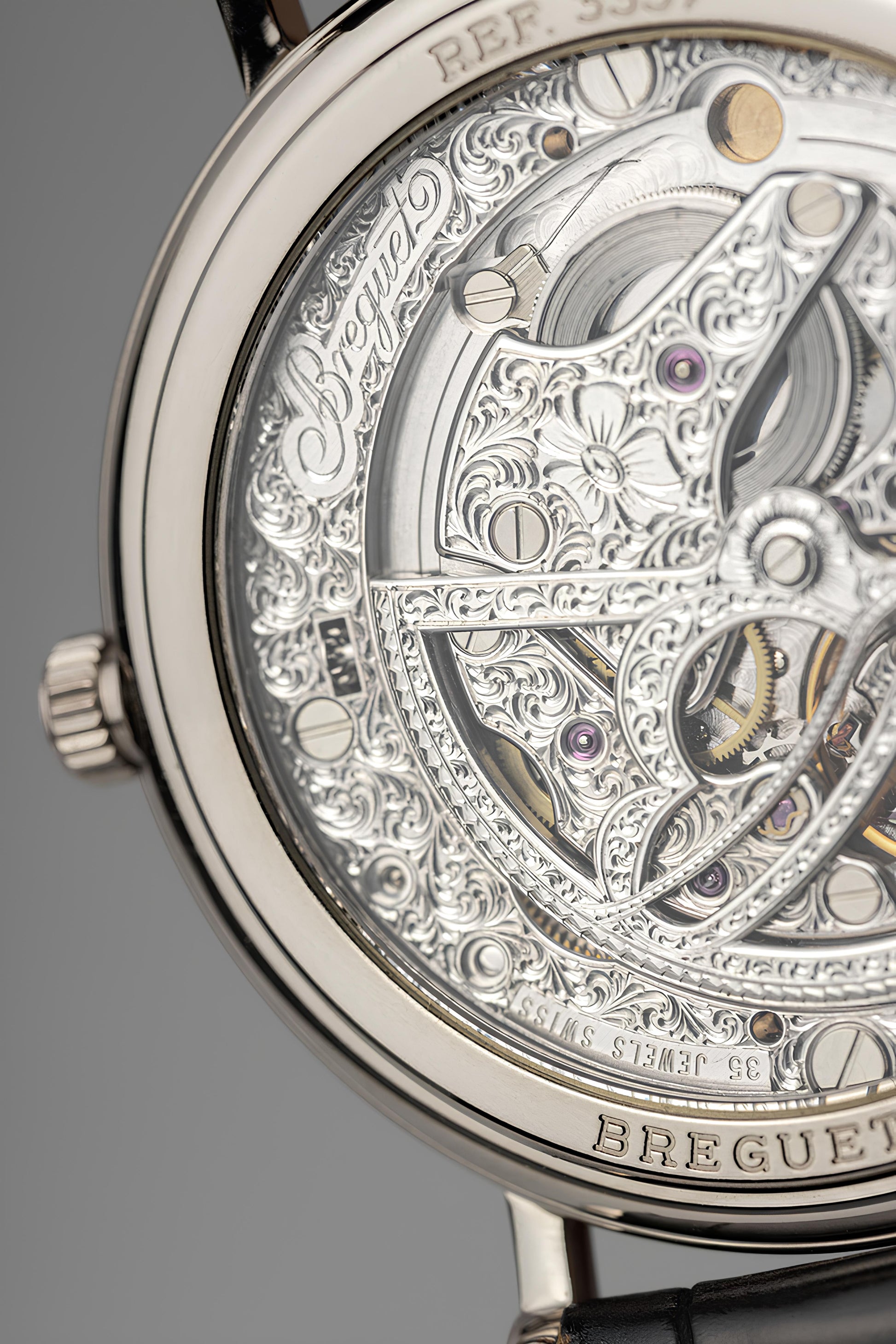 The silvered dial is a true work of art, hand-engraved with the brilliant Clous de Paris pattern. This solid gold, silvered dial captures light spectacularly, while Breguet's signature blued steel hands provide a captivating contrast against the silvered backdrop and white gold case, adding a touch of sophisticated color.