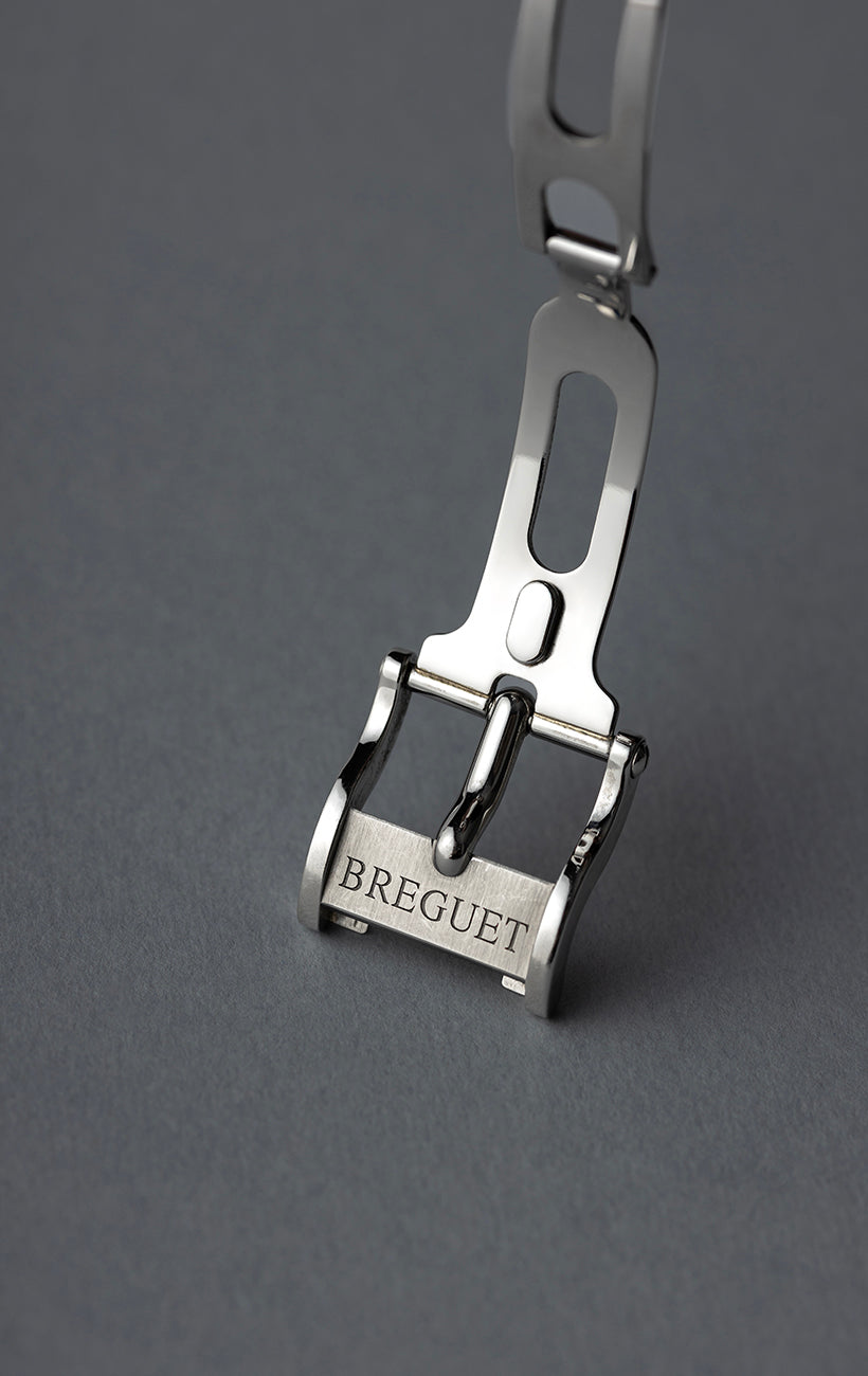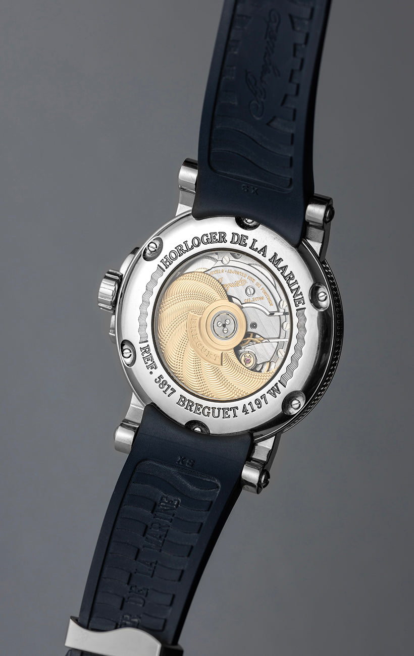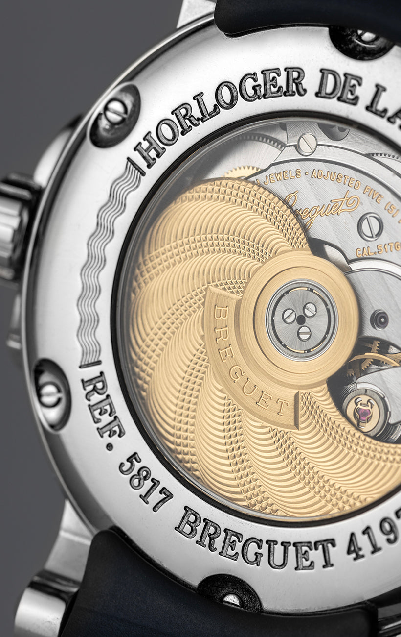 The watch comes with a textured navy blue rubber strap, as well as an additional black strap, both equipped with a signed stainless steel folding clasp. Powered by the Breguet Calibre 517GG automatic movement, visible through the sapphire crystal caseback, this piece reflects the brand’s commitment to technical excellence.
