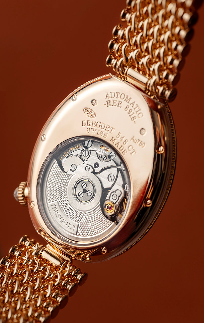 This precious Breguet, crafted in a refined 18-carat rose gold case, retains the distinctive oval shape and the mother-of-pearl dial with blue indexes, crafted with extraordinary craftsmanship. The bezel and flange are adorned with 117 diamonds, while the crown is adorned with a 0.26-carat briolette diamond. This timepiece embodies timeless feminine elegance, while maintaining a modern versatility that makes it suitable for any enthusiast of fine watchmaking. The delicate design of the sinuous and thin hands, together with the mother-of-pearl dial, evokes a regal beauty, perfect for special occasions. The case measures 36.5 mm by 28.5 mm, while the automatic movement, Breguet caliber 537/3, offers a 45-hour power reserve. Completed with a precious rose gold bracelet, this watch is the perfect combination of refined craftsmanship and discreet luxury.