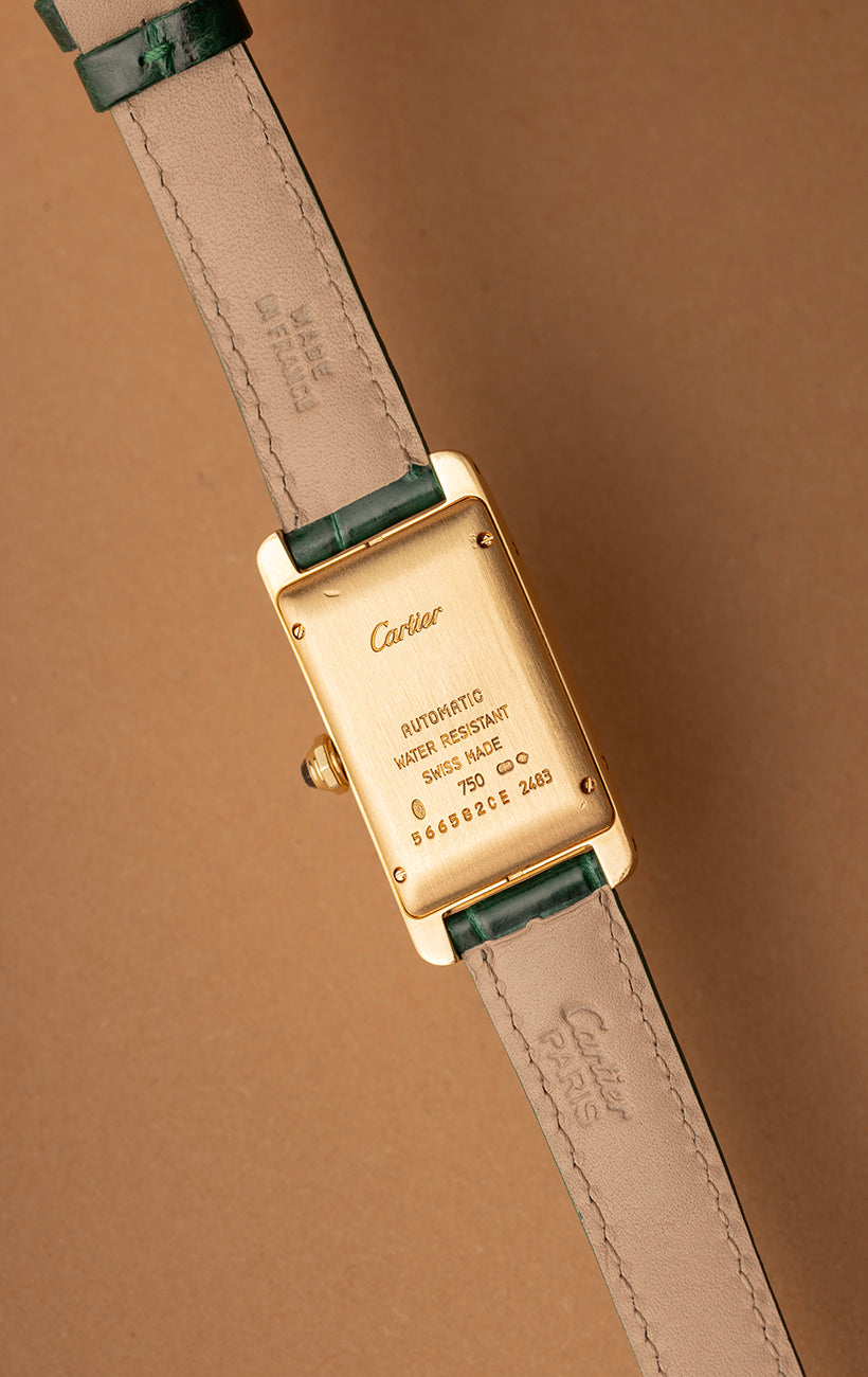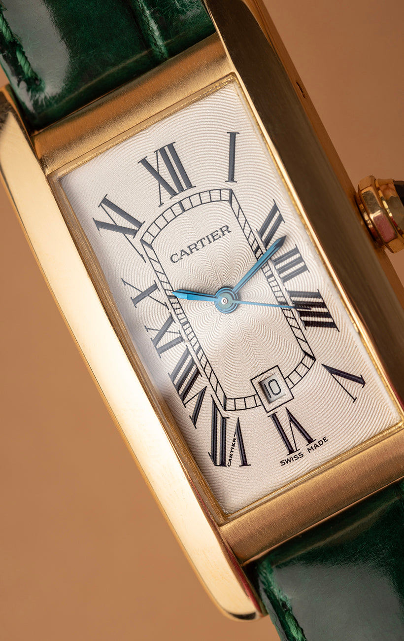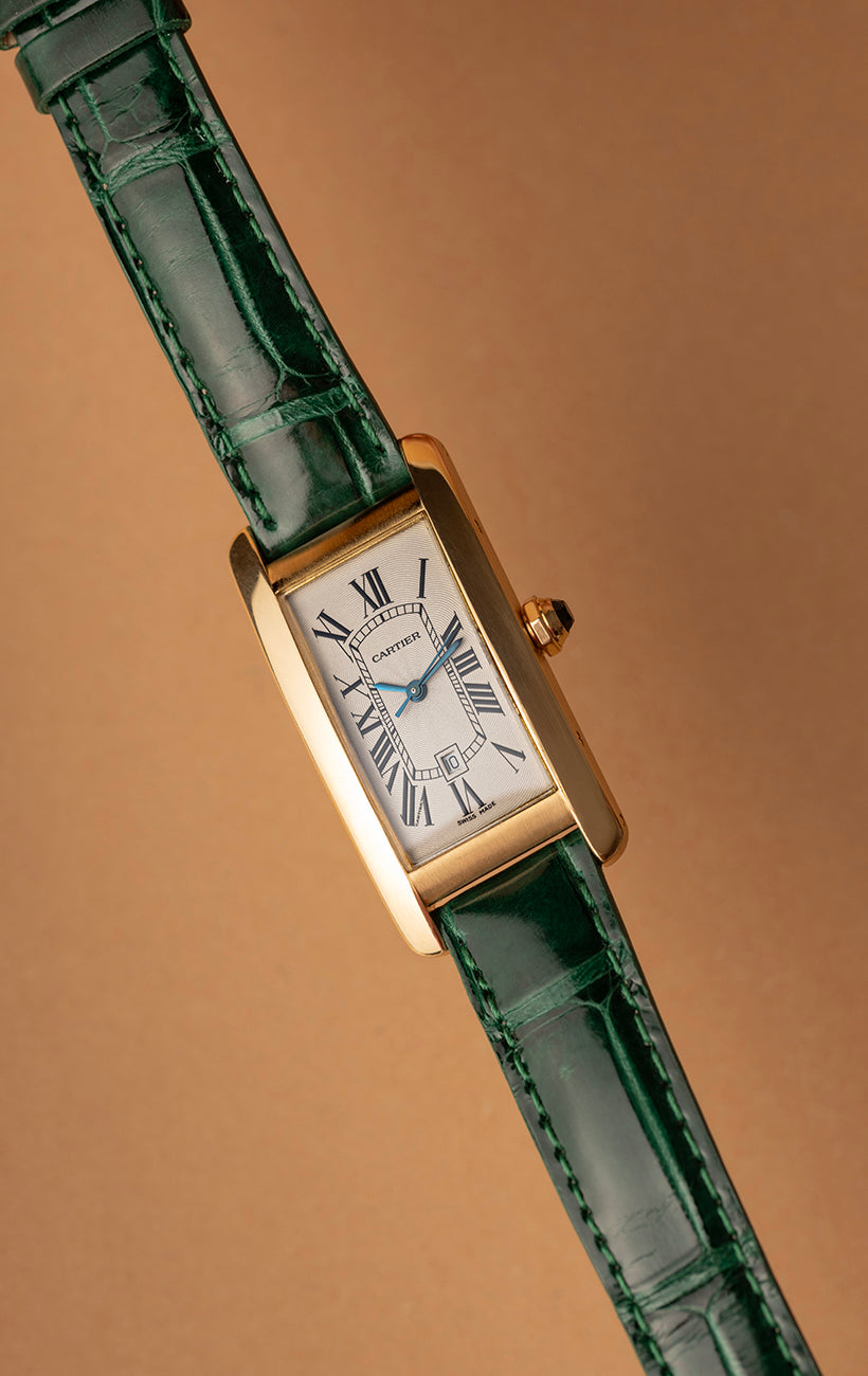 This beautiful Cartier Tank is in excellent condition. Recently serviced and polished, it is fitted with a shiny green crocodile leather strap, no brand, and an original Cartier yellow gold pin buckle.