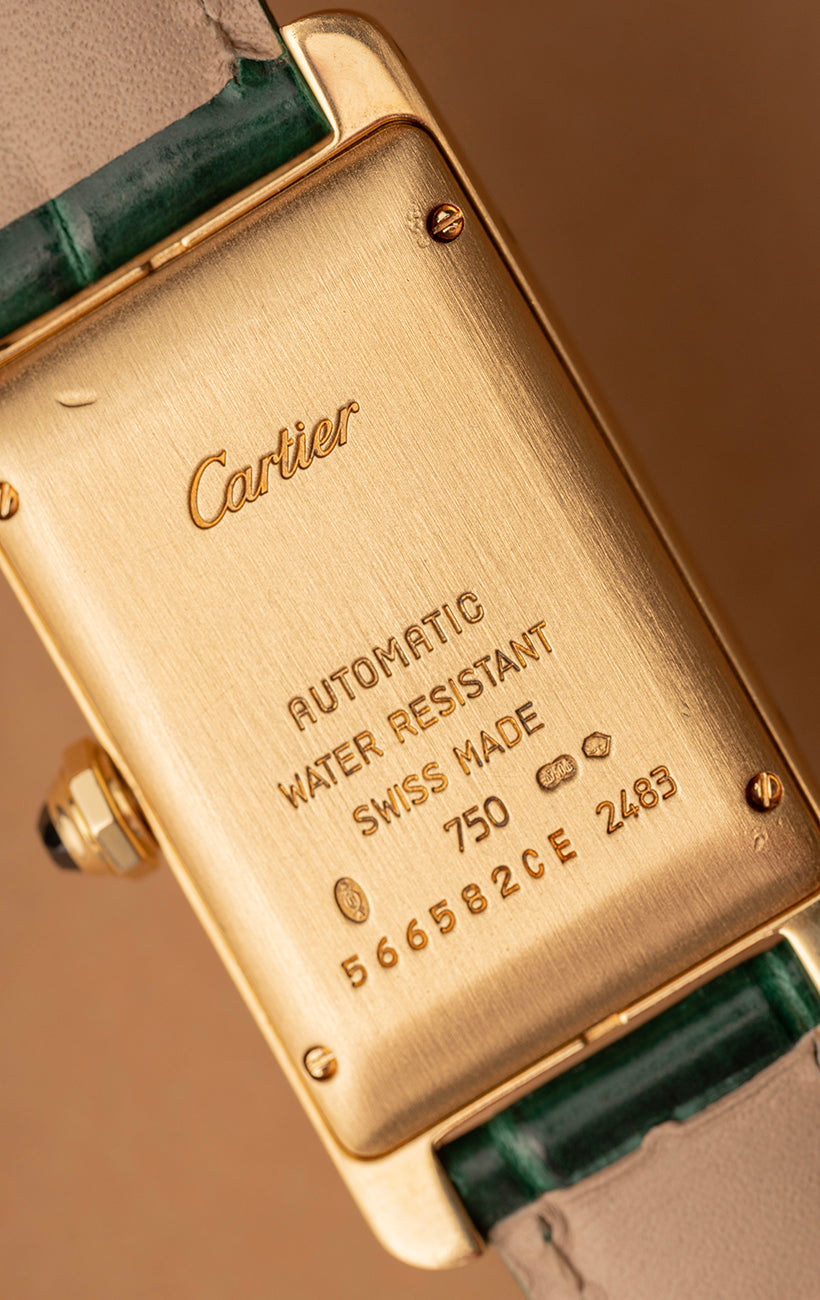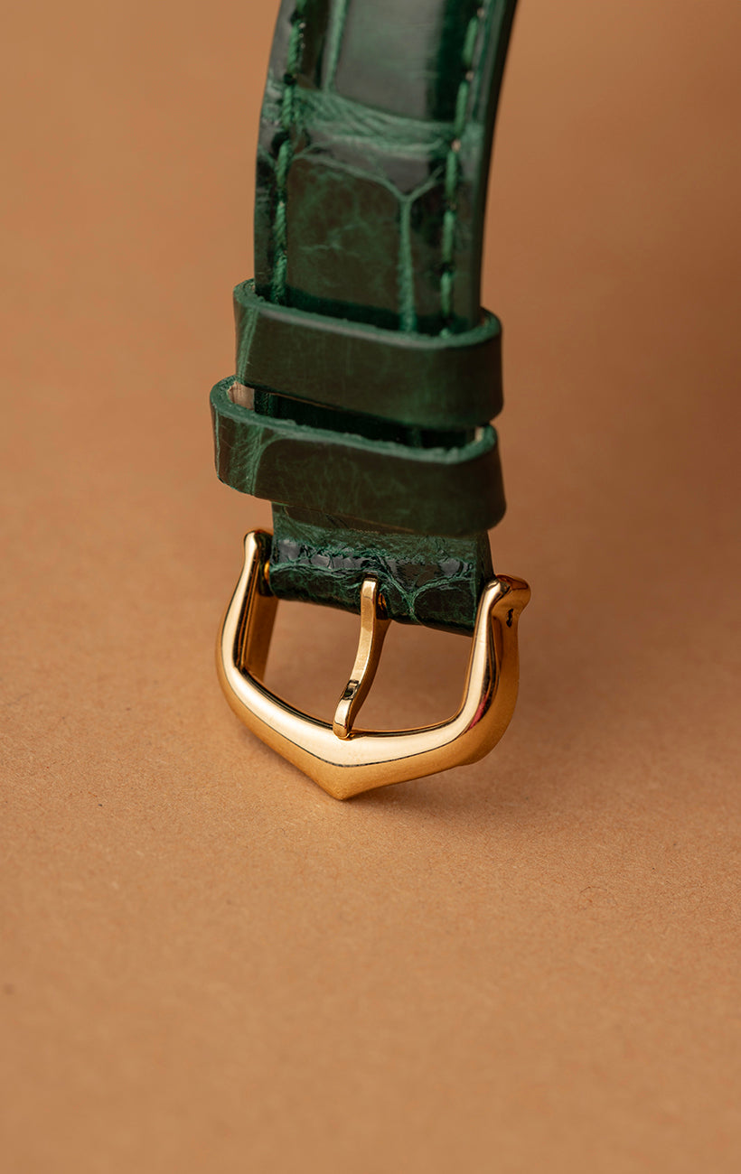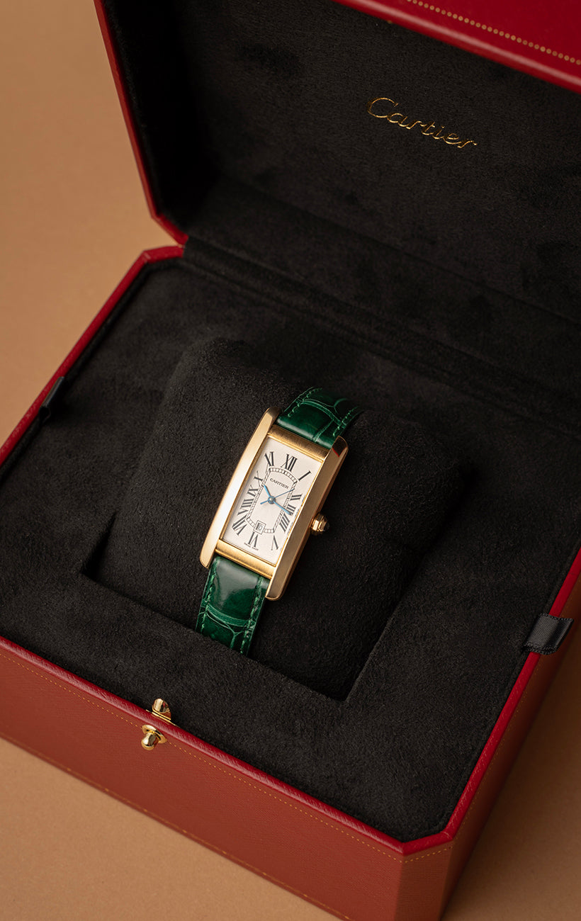 This beautiful Cartier Tank is in excellent condition. Recently serviced and polished, it is fitted with a shiny green crocodile leather strap, no brand, and an original Cartier yellow gold pin buckle.