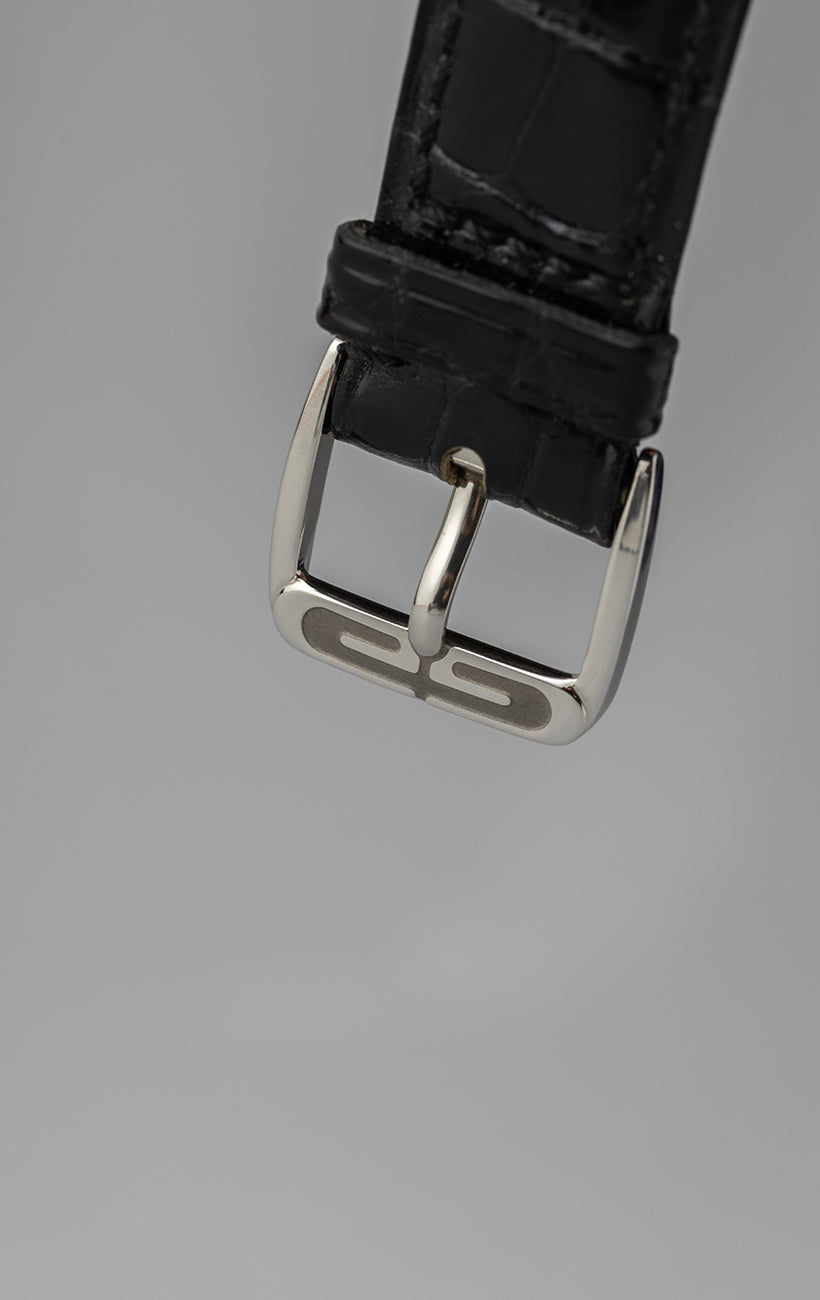 The Gérald Genta Retro Classic G3634 is a refined example of the watchmaking ingenuity of one of the greatest masters of 20th-century design. Featuring a 36 mm stainless steel case, this model combines elegant proportions with a sophisticated technical complication: the retrograde minutes on a semi-circular scale and the jumping hours, displayed via a digital aperture at 6 o'clock. The understated and highly legible matte black dial stands out for its Art Deco-inspired style, while the smooth bezel and fluted caseband lend the design a distinctive and timeless touch.