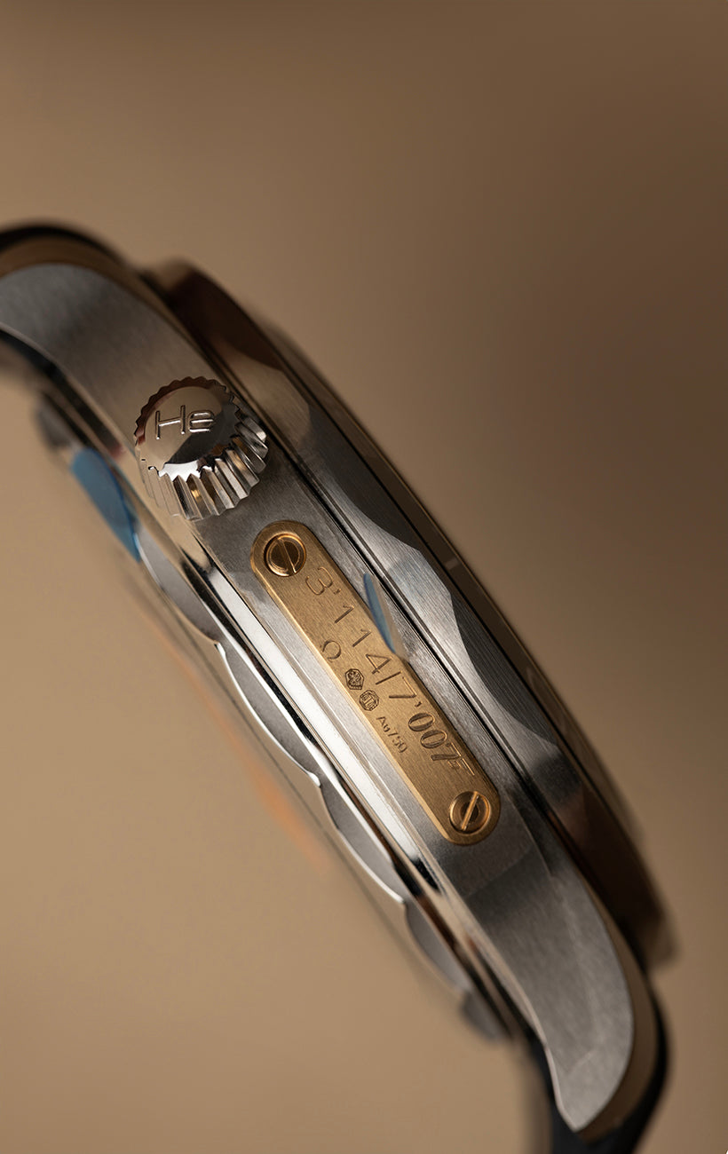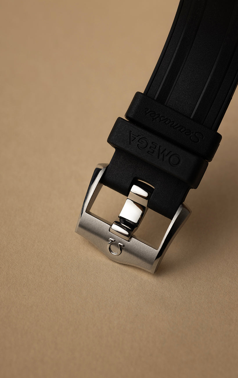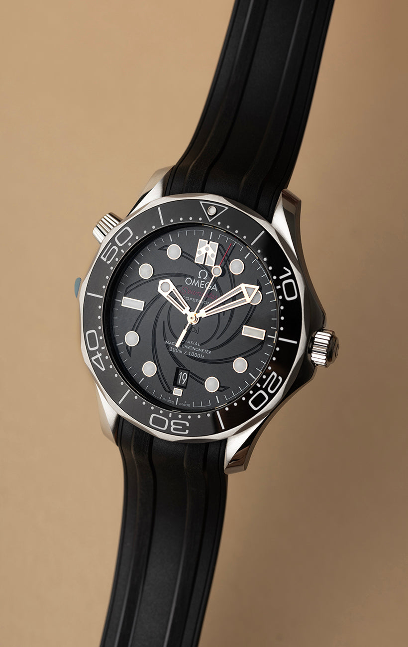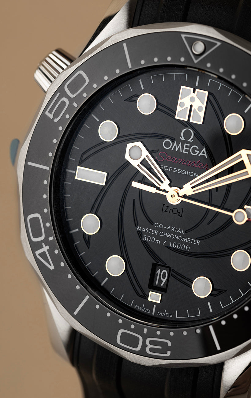 The Seamaster Diver 300M 50th Anniversary Of ohmss features a number of nods to the film, one of which is quite unusual. The dial depicts the view of the barrel of a firearm that opens the opening credits sequence of the James Bond films, while the number 7 on the date bezel uses the same font as the number in the famous 007 logo. At night, there is a “secret signature” on the 10 o’clock lume plot, where the number 50 appears inside the lume circle. The most interesting feature for hardcore Bond fans, however, will be the 12 o’clock marker, which is a stylised representation of the Bond family crest, as seen in the film. Otherwise, it is a standard Seamaster 300M, with a co-axial escapement, 300 metres of water resistance, a helium escape valve and Master Chronometer certification.