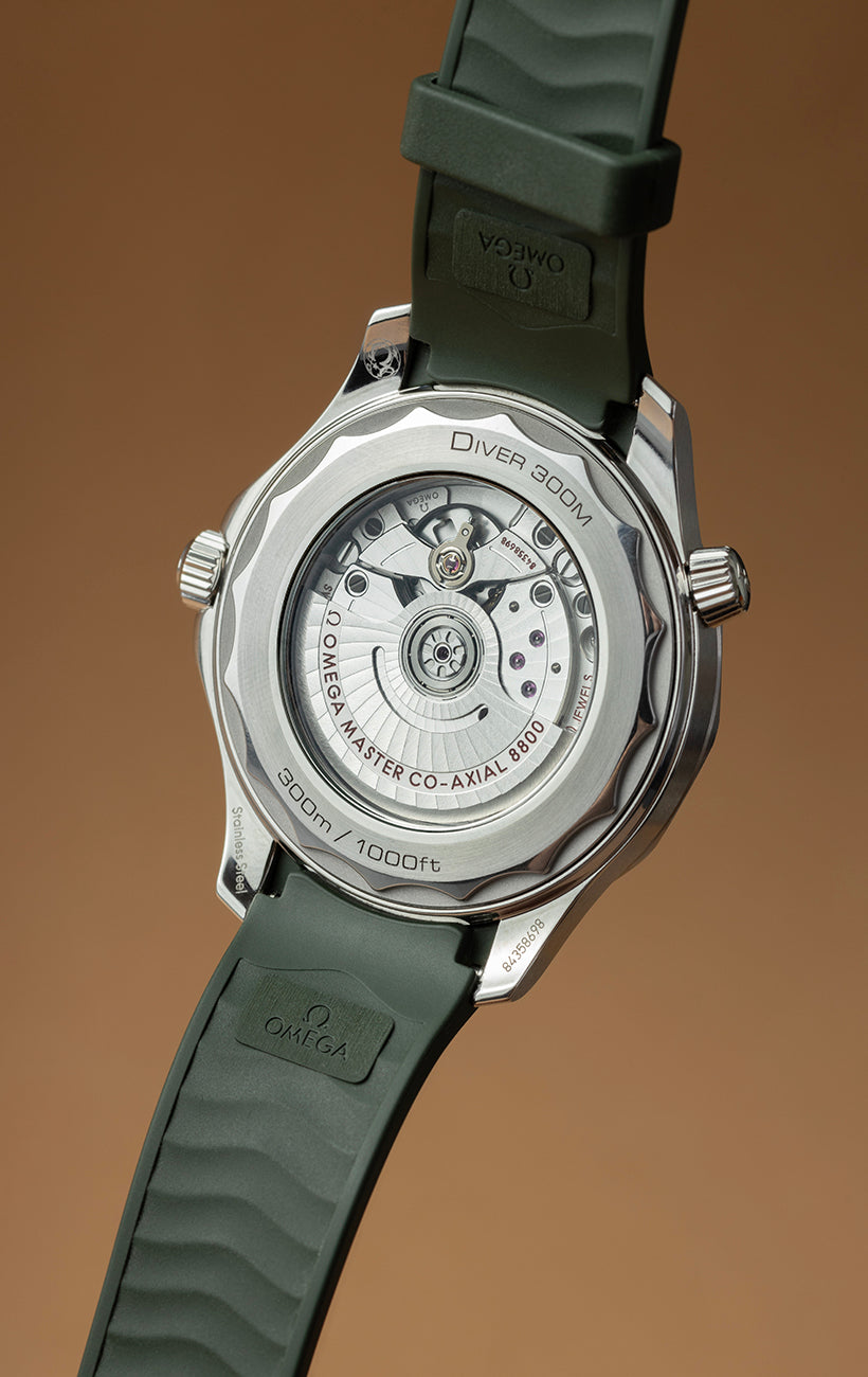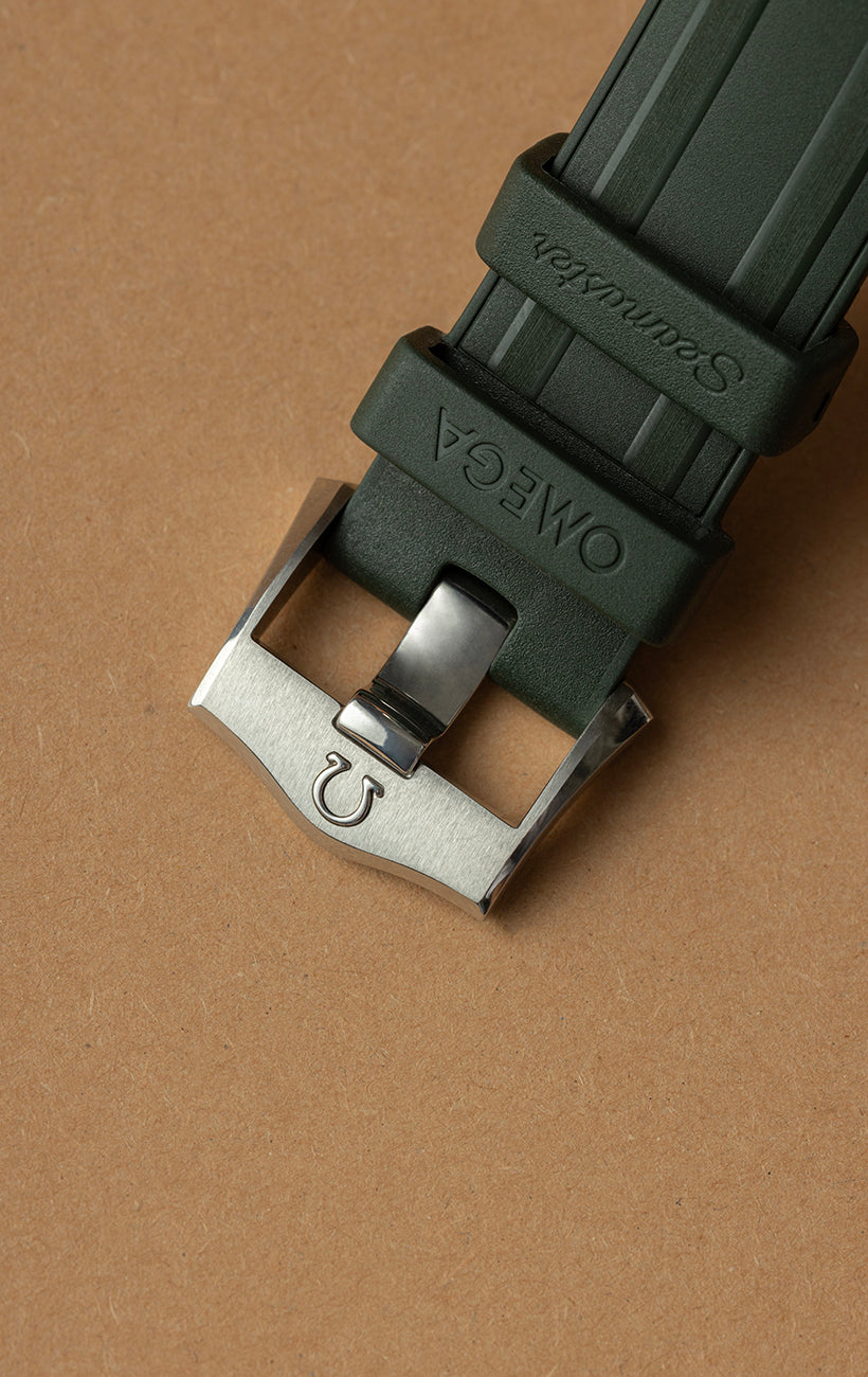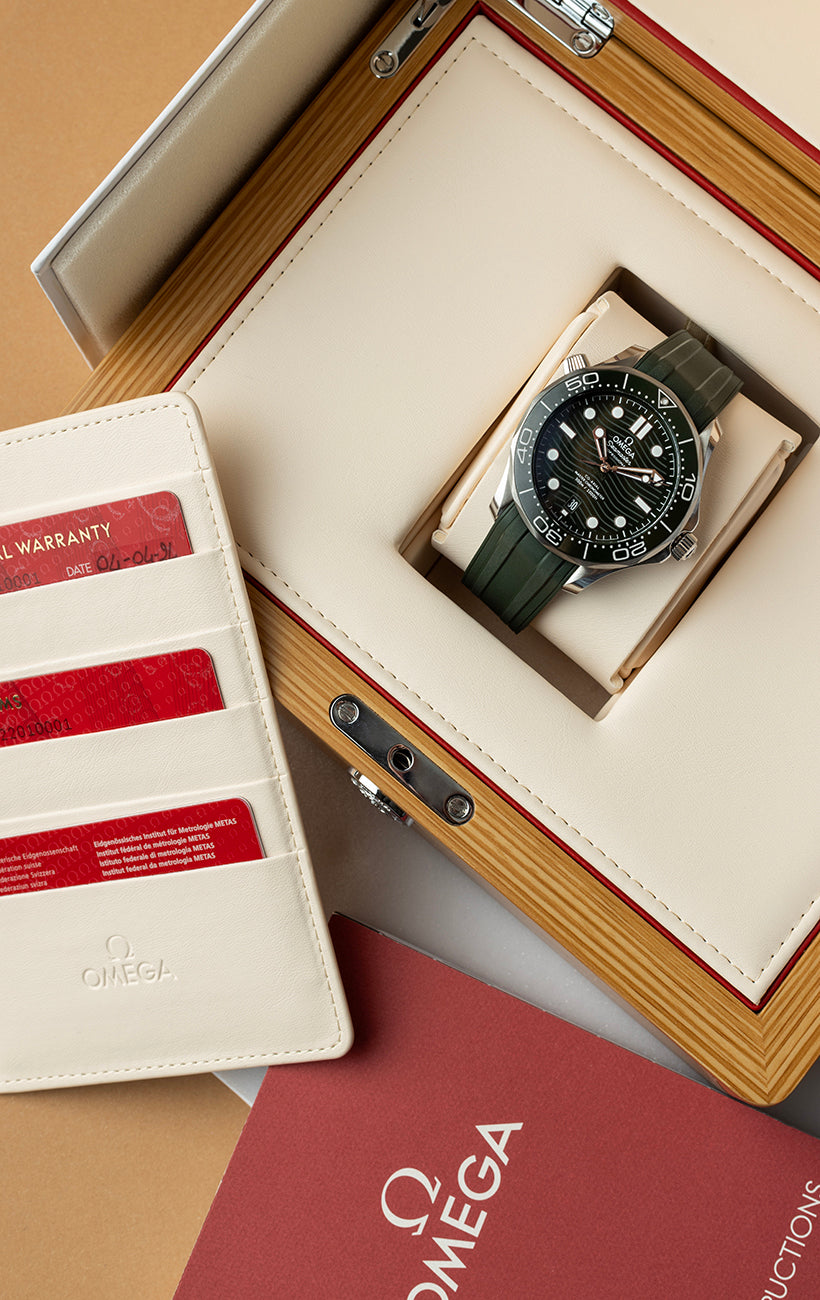 This particular model, Reference 210.32. 42.20. 03.001, features the classic 42mm twisted lug case design, a helium escape valve at 10 o’clock, a fluted bezel with a green ceramic insert, and a wavy luminous green ceramic dial with matching skeleton sword hands. The model comes with two original bracelets: one in green rubber with a signed steel pin buckle, and the second in stainless steel, and is powered by Omega’s Calibre 8800 Master Chronometer automatic movement, visible through the sapphire crystal caseback. Warranty card dated: 04-04-2024.