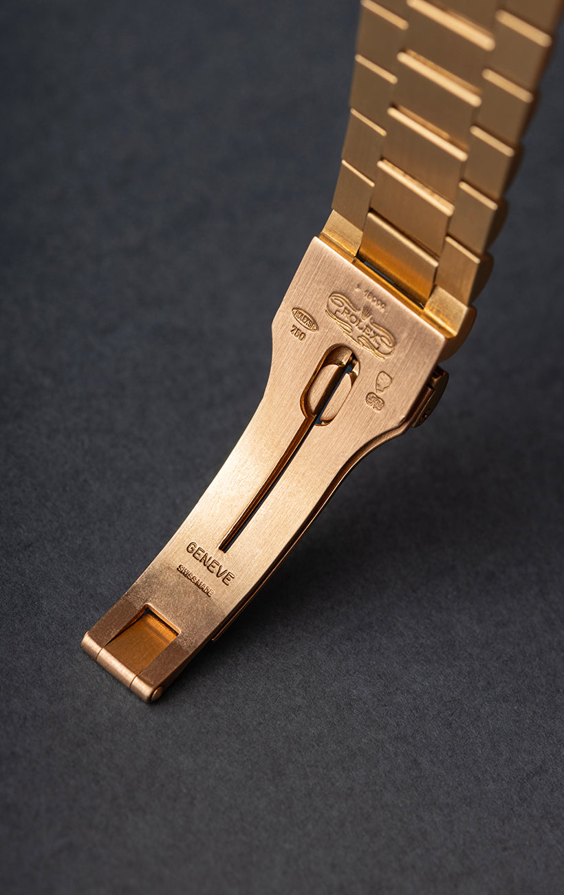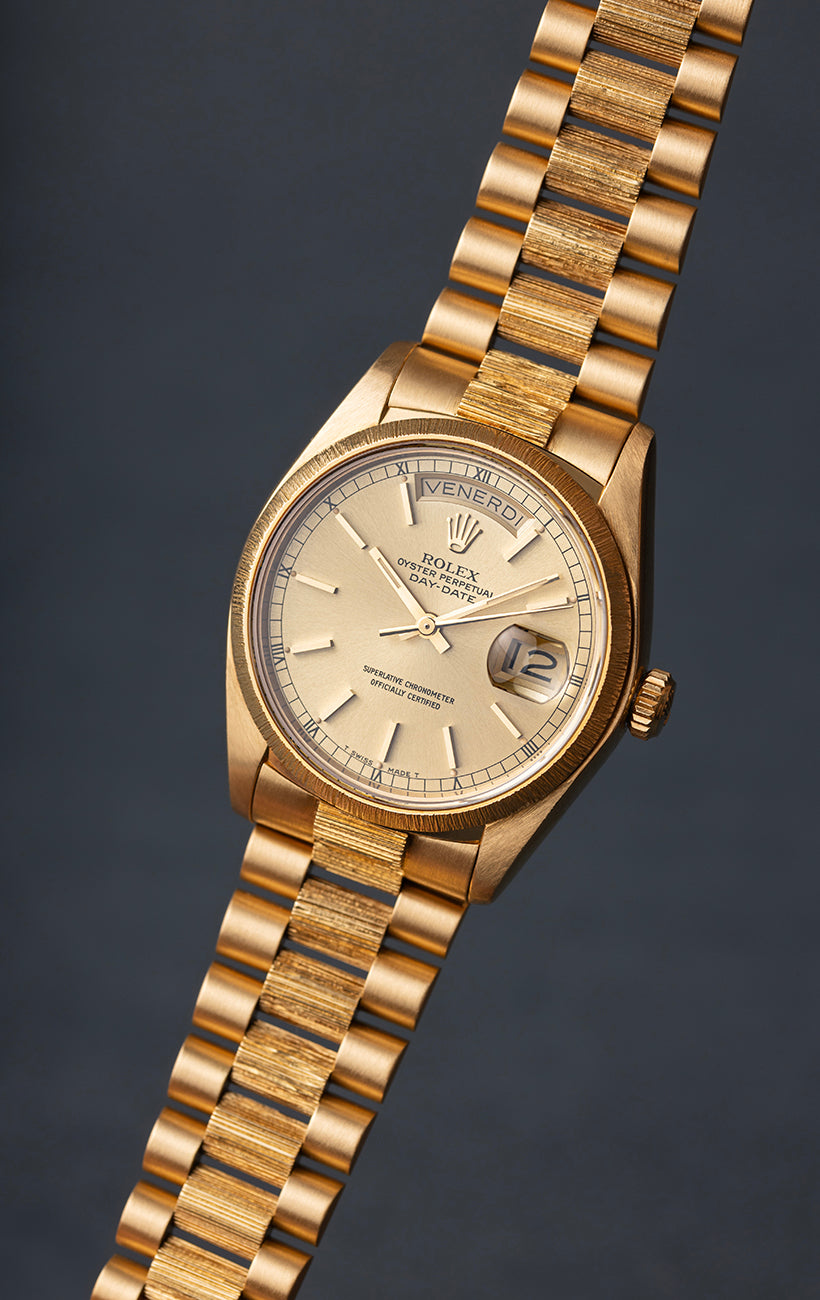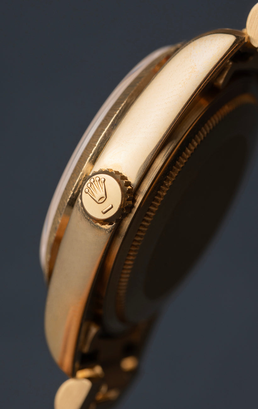 This Rolex Day-Date is impeccably preserved, showcasing minimal signs of wear on both the case and bracelet. The gold dial retains its pristine condition, devoid of any aging or texture imperfections, with legible engravings adding to its allure. While the case back displays subtle indications of use, it remains in excellent overall condition. This watch is accompanied by its original box.