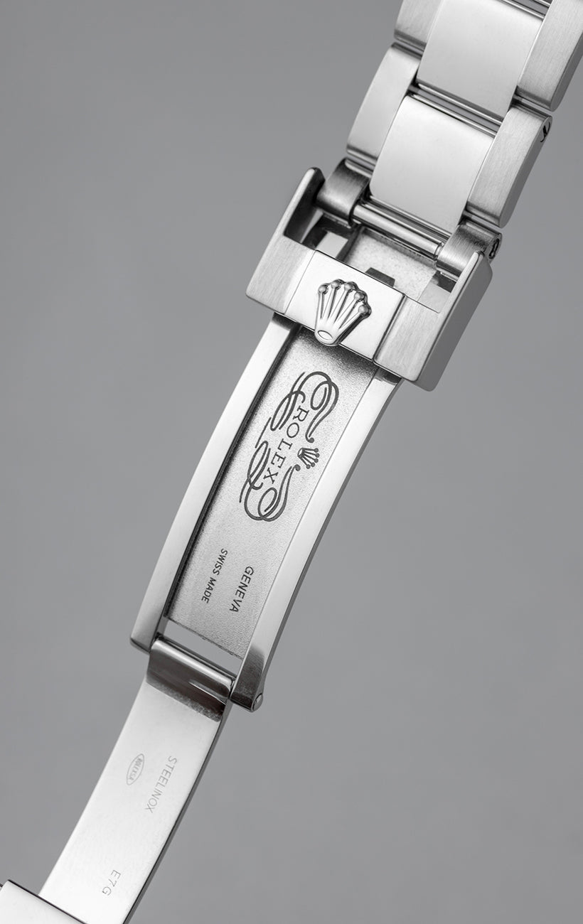 The steel Oyster bracelet with polished central links is completed by the Oysterlock clasp with Easylink system, which allows the bracelet length to be extended by 5 mm for greater comfort. The serial code and internal markers indicate the production year 2011, with the flange engraved “ROLEX ROLEX” and the serial number visible at 6 o'clock.