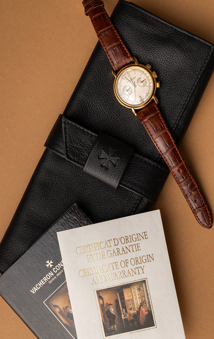 This Vacheron Constantin Les Historiques Chronograph 47101/2 is in pristine condition. The watch exhibits no noticeable signs of wear, and the movement operates flawlessly. It comes as a complete set, featuring the original box, documentation, and warranty, perfect for the most discerning and meticulous collectors