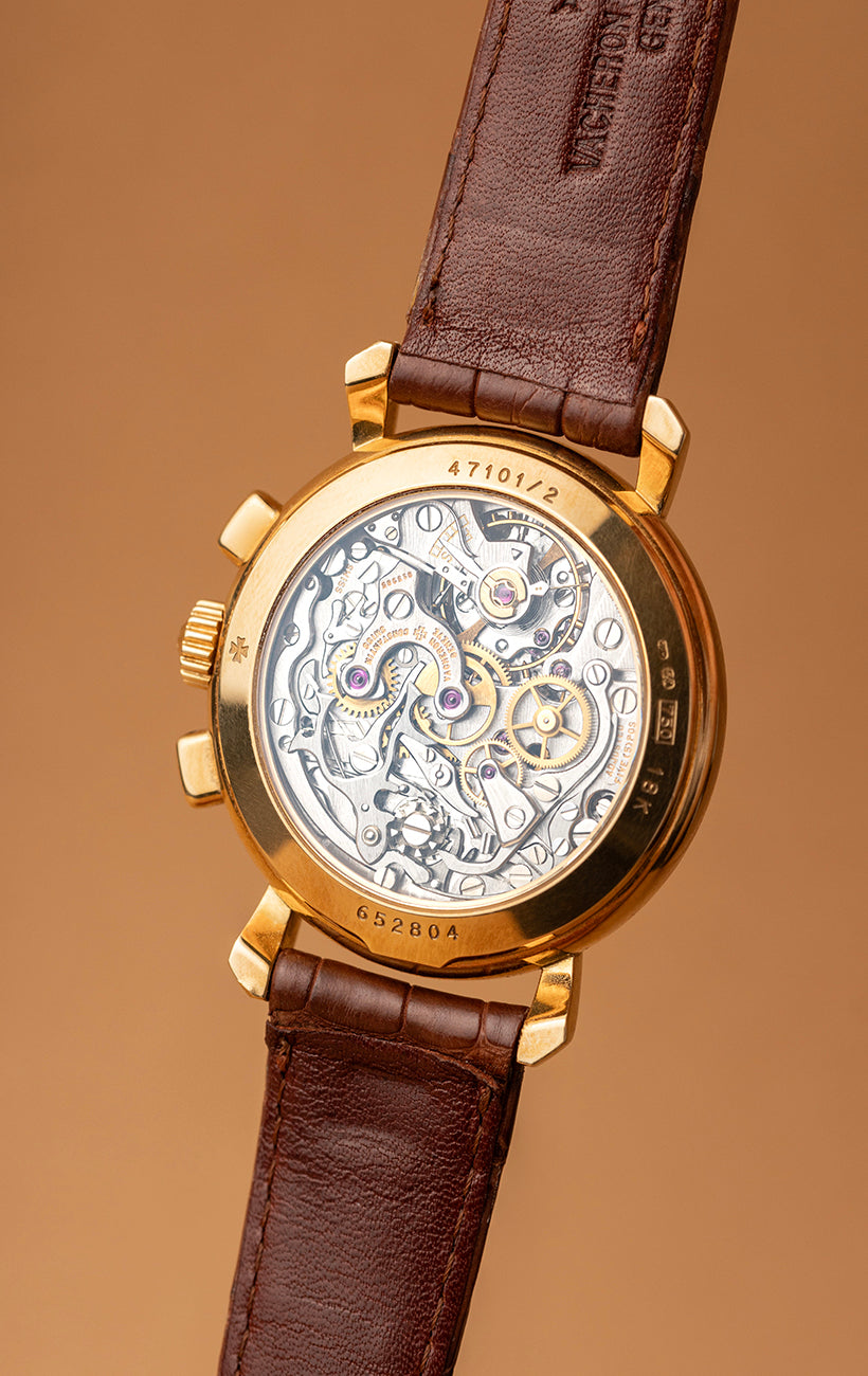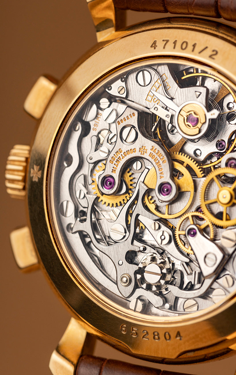 Turn the watch over to reveal the transparent case back, showcasing the highly finished Vacheron Cal. 1140 movement, based on the legendary Lemania Cal. 2310. With 21 jewels, a self-compensating Breguet spring, a swan-neck regulator, and precise adjustment in 5 positions, this movement highlights Vacheron's dedication to mechanical excellence and intricate detailing.