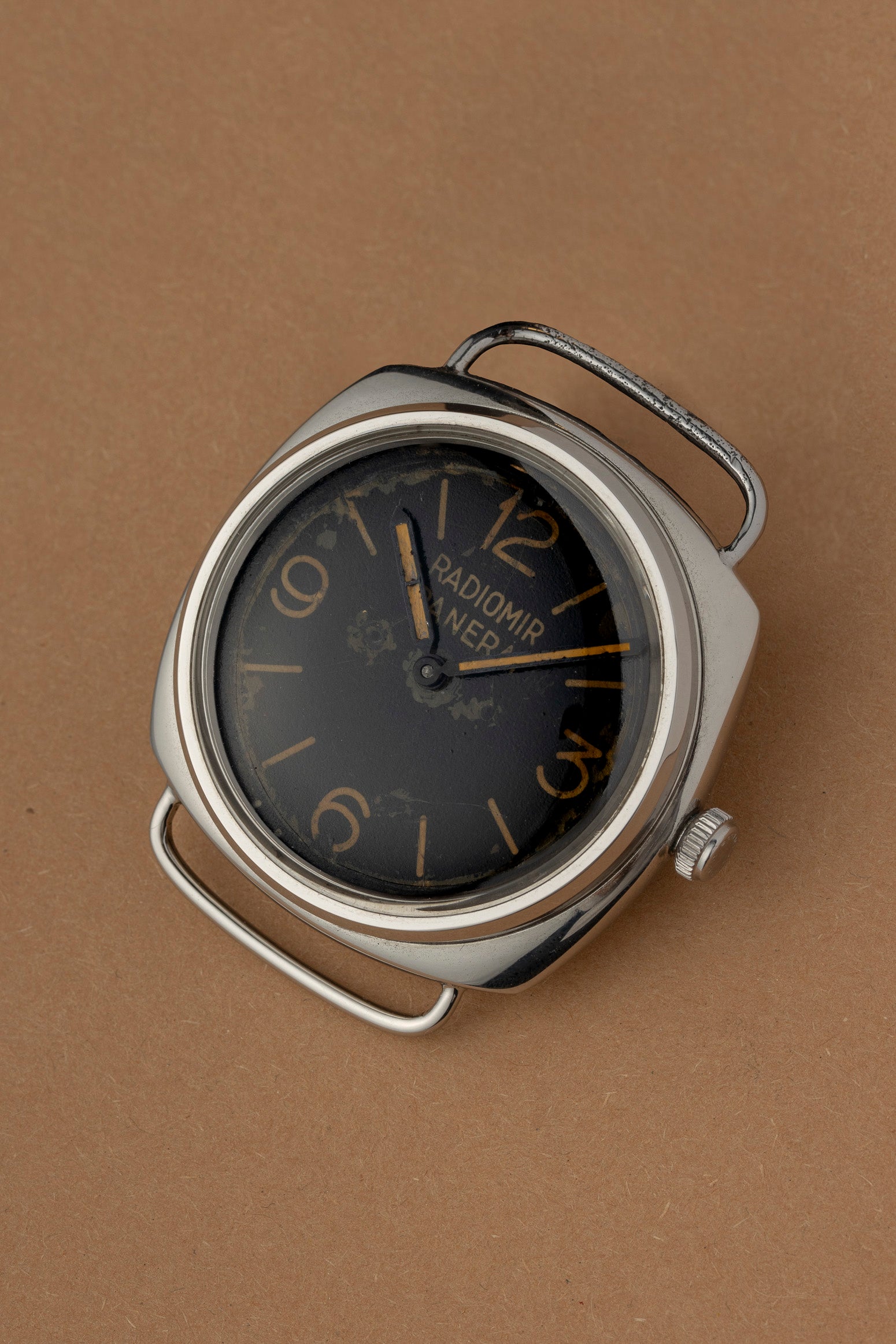 La cassa in acciaio da 47 mm, a forma di cuscino con anse a filo e linee morbide, incarna il linguaggio estetico più primitivo del Radiomir. Nonostante le dimensioni importanti, conserva un’eleganza essenziale: un design generato dalla necessità operativa, non da un intento stilistico. Il fondello avvitato e la corona conica sovradimensionata raccontano la sua natura utensile, concepita per resistere agli ambienti ostili in cui questi strumenti erano chiamati a operare.