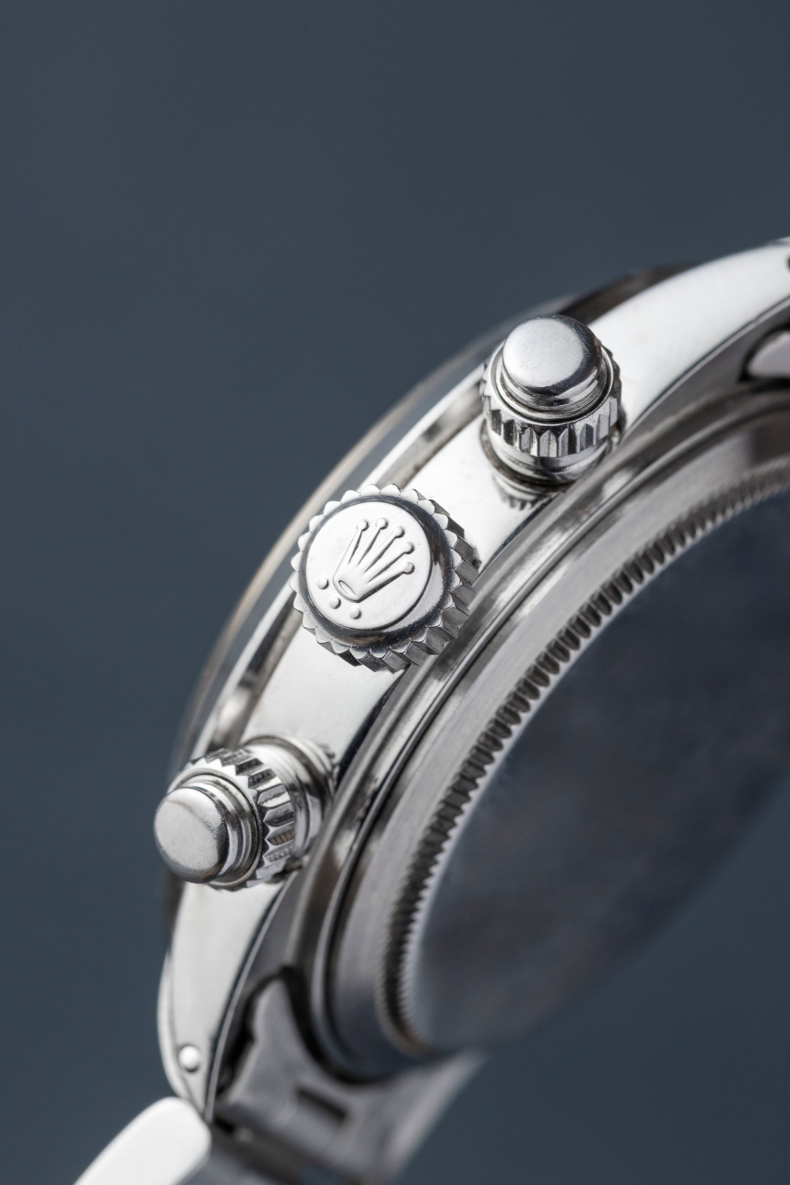 La cassa in acciaio inossidabile da 37 mm presenta proporzioni compatte, un profilo lucido e una carrure piena, mantenendo la robustezza tipica dei Daytona pre-Zenith. Al suo interno batte il movimento a carica manuale Valjoux 727, calibro affidabile e preciso che garantisce un funzionamento fluido del cronografo, con secondi centrali e contatori ausiliari per minuti e ore.